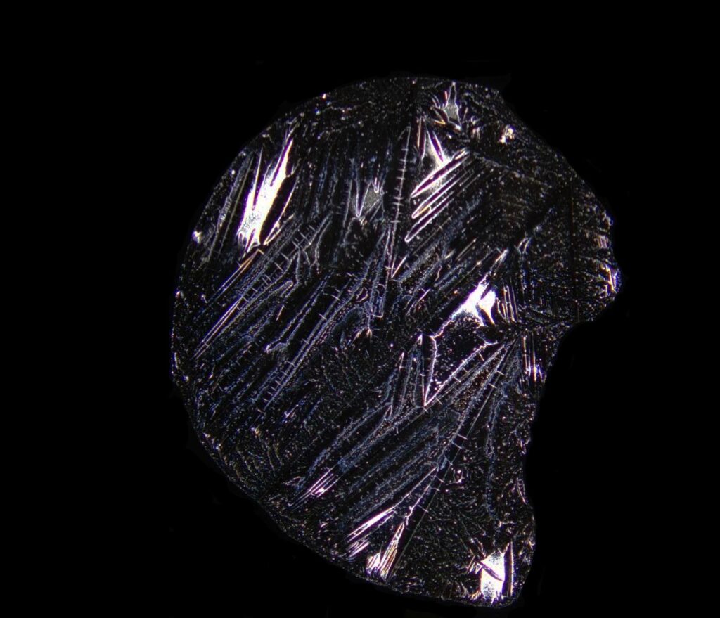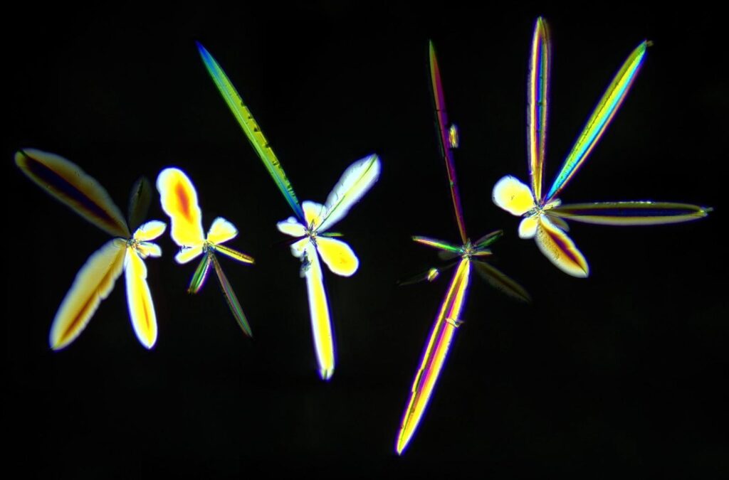 En vino, la lectura del patrón puede afinarse bastante más de lo que parece a simple vista. No todo se reduce a decir que una imagen está más ordenada o más desestructurada: en la evaporación de gota aparecen al menos dos familias de formas que conviene aprender a distinguir, unas más aciculares y otras más florales. Las primeras tienden a crecer en ejes opuestos, con puntas largas y simetrías muy marcadas; las segundas se abren desde un centro en varias direcciones y generan dendritas más densas, con una apariencia más ramificada. Esta distinción es útil porque permite pasar de una impresión subjetiva a una lectura más concreta del patrón, y abre la puerta a comparar no solo “qué forma vemos”, sino también cómo se organiza esa forma y qué relación guarda con la composición del vino.