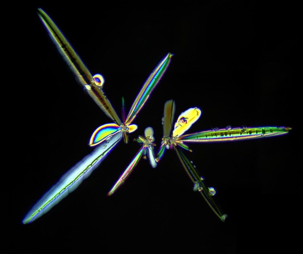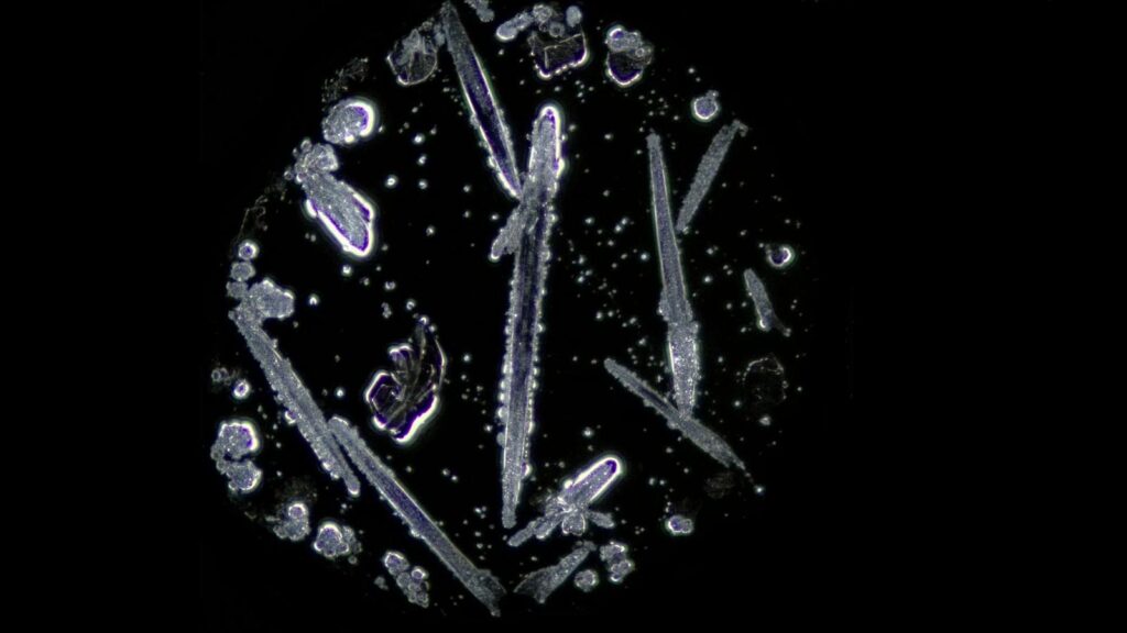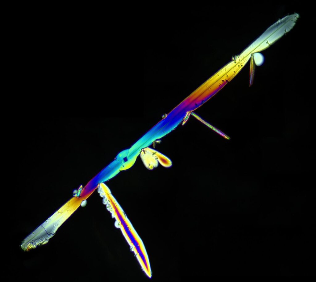 Además, la morfología del residuo no parece depender solo del secado, sino también de la propia composición del vino. En particular, los compuestos fenólicos y la intensidad del color pueden influir de forma clara en la geometría final del cristal, mientras que parte de las estructuras observadas se ha relacionado con cristalizaciones de bitartrato potásico modificadas por la presencia de fenoles. Esto ayuda a poner la imagen en contexto: cuando vemos agujas más finas, placas más delgadas, formas más redondeadas o mayor solidez geométrica, no estamos mirando un dibujo aislado, sino la posible huella de interacciones físico-químicas reales dentro del vino.