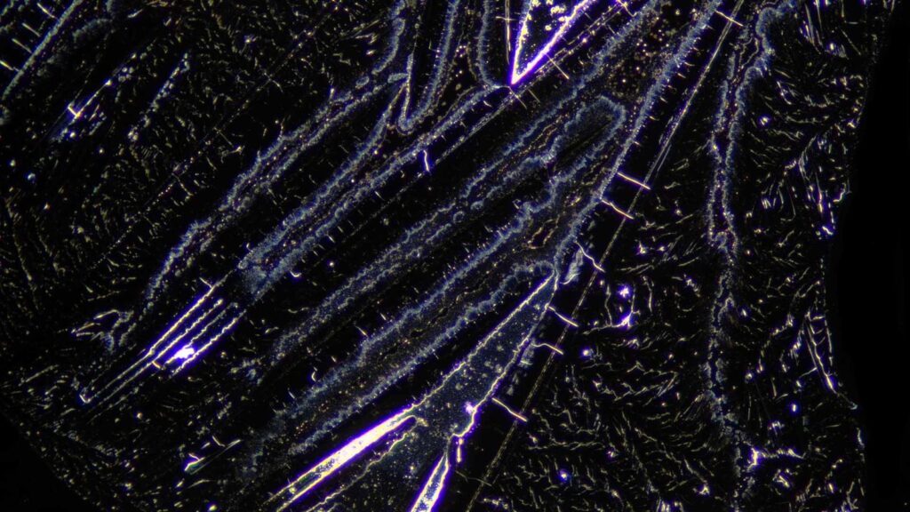 Aquí vemos patrones más duros, lineales y fragmentados, con presencia de agujas o bandas rectilíneas, mayor cantidad de puntos o partículas alrededor, y en algunas imágenes una ocupación más irregular del campo. La impresión visual general es más cercana a: